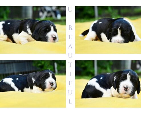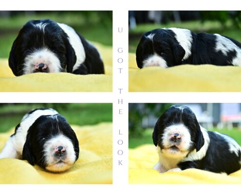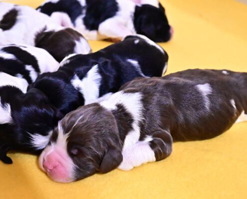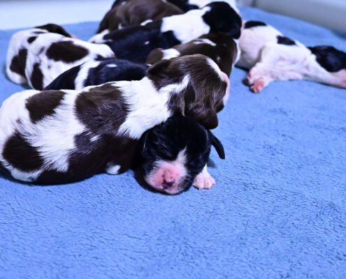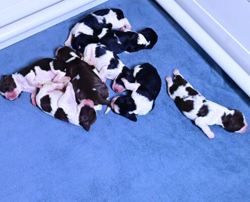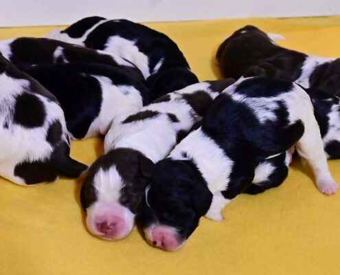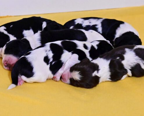 Wir haben 2 schwarze Jungs, 2 braun-weiß-loh Jungs, 1 braun-weißes Mädel, 1 braun-weißer Bub und 2 schwarz-weiße Mädels.